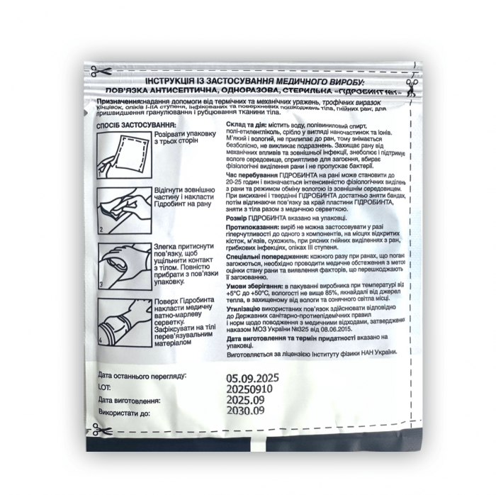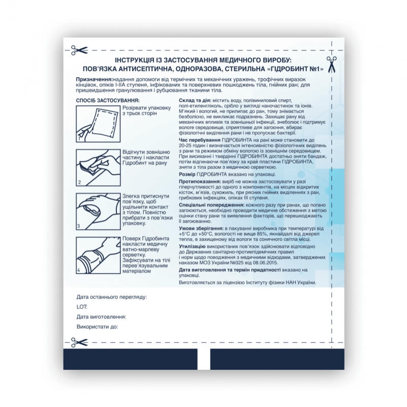 Застереження: Самолікування може бути шкідливим для вашого здоров’я. Перед використанням ознайомтесь з інструкцією і проконсультуйтесь з лікуючим лікарем. Не використовувати “ГІДРОБИНТ №1” після закінчення терміну придатності та при наявності пошкоджень упаковки. Тільки для зовнішнього застосування. Зберігати у недоступному для дітей місці.