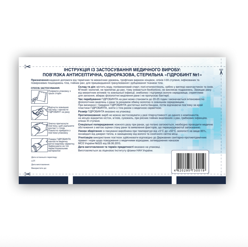Застереження: Самолікування може бути шкідливим для вашого здоров’я. Перед використанням ознайомтесь з інструкцією і проконсультуйтесь з лікуючим лікарем. Не використовувати “ГІДРОБИНТ №1” після закінчення терміну придатності та при наявності пошкоджень упаковки. Тільки для зовнішнього застосування. Зберігати у недоступному для дітей місці.